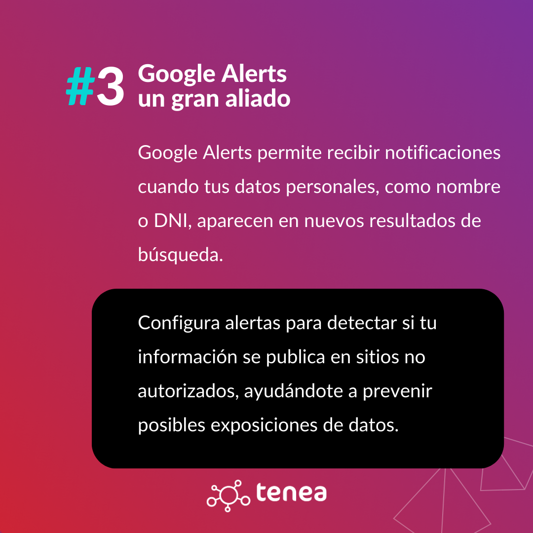 Google Alerts es un servicio gratuito que permite configurar alertas para recibir notificaciones cuando se publican nuevos resultados de búsqueda que contienen términos específicos. Configurar alertas para el nombre completo, DNI u otros datos personales relevantes puede ayudar a detectar si esta información aparece en sitios web no autorizados, lo que podría indicar una posible exposición de datos.