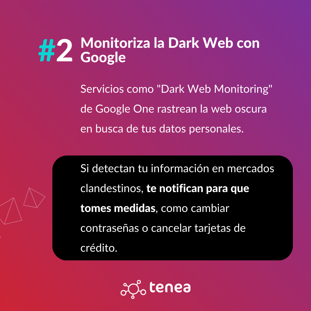 La web oscura, una parte de Internet no indexada por los motores de búsqueda convencionales, es un entorno donde se comercializan datos robados. Servicios especializados como «Dark Web Monitoring» de Google One o «HaveIBeenSold» emplean técnicas de rastreo para identificar la presencia de datos personales en mercados y foros clandestinos. Estos servicios notifican al usuario si sus datos son detectados, lo que permite tomar medidas preventivas como cambiar contraseñas o cancelar tarjetas de crédito.